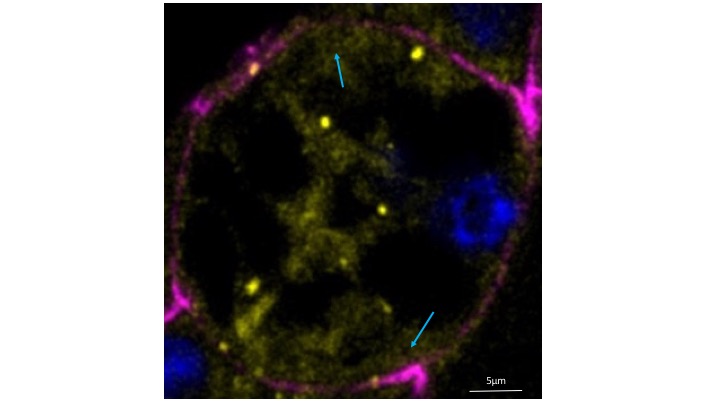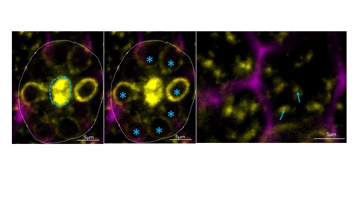 Different terms will be used to describe the Rab-marked structures found in the accessory gland. First, “central mass” which is a dense filamentous-like structure or central well, whose mass center is located at the center of the secondary cell (Figure 2 and 3A); “vacuoles” refer to hollow and membrane-delimited structures whose diameter can vary from 0.3μm to 8μm (Figure 3B). “small compartments” are features >0.5µm whose intra-cellular space is not visible (Figure 3C). “punctate” structures are particulate structures smaller than 0.5μm in diameter (Figure 4). And finally “diffuse” features describe staining that is spread out without visible particulate structures (Figure 5). On the summary diagrams, each of the structures is represented by a symbol according to the following key: