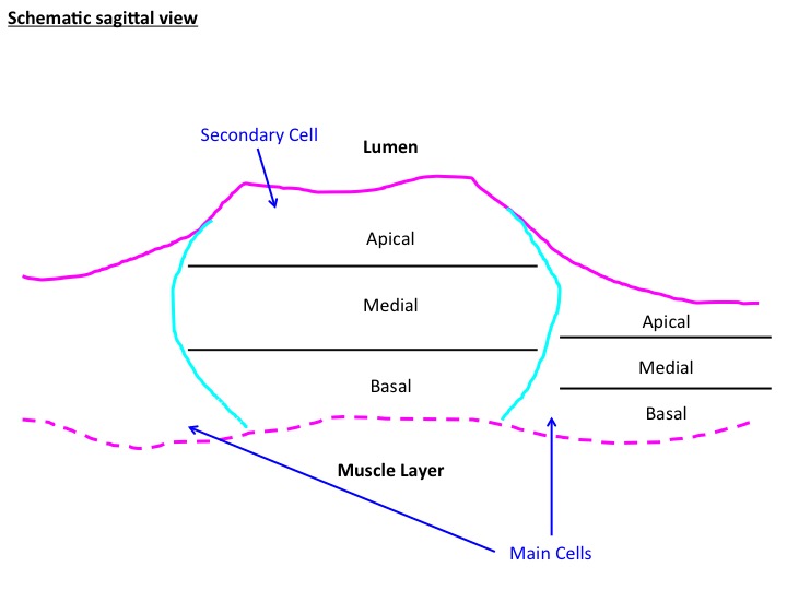 To describe the position of each of the Rab-labeled structures within the various cell types, we defined zones along the apical-basal axis and radial zones emanating from a line going through the cell’s center of mass along the apical-basal axis (see Figure 7 and Figure 8). To make the zones along the apical basal axis, we simply divided the cell into three, approximately equal zones (as defined by DE-CAD and DLG staining) called: apical, medial and basal. The radial zones were defined differently in each cell type. For the main cells, two zones were defined. Structures that touch the lateral plasma membrane were called “Cortical” and all other interior structures were simply called “Cytoplasmic”. For the secondary cells, three radial zones were defined. “Central” features correspond to those that are within an 8.90µm diameter cylinder centered on the central axis. “Cortical” features refer to those that are in contact with the lateral plasma membrane. Meanwhile all other structures are simply referred to as “non-central, cytoplasmic” or “NC cytoplasmic (Figure 8 ).